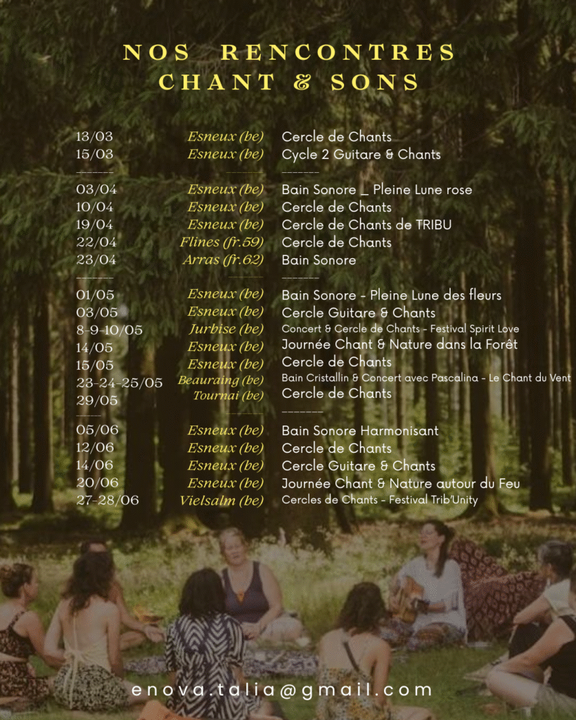 dans l’ouverture à notre intériorité, à nos voix et notre créativité en reliance aux cœurs vibrants, à la nature et la magie..